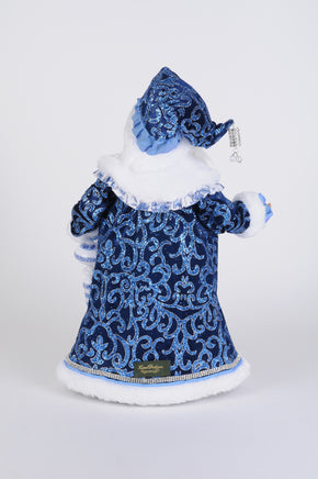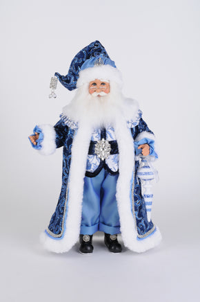 Bring home the beauty of a winter wonderland with the Jewled Chinoiserie Santa figurine, a stunning representation of seasonal elegance and frosty magic. Draped in shimmering blues and snow-white accents, this Santa is a regal addition to your holiday décor. His velvet coat, intricately embroidered with glittering silver swirls, is lined with plush white faux fur, while his satin trousers and brocade vest evoke a timeless sophistication. A dazzling jeweled brooch adorns his belt, and he carries an ornate, blue-and-white scepter that echoes the delicate charm of fine porcelain. His deep blue hat, finished with a rhinestone tassel and snowflake detail, completes this royal ensemble. Whether displayed by the hearth or as a tabletop centerpiece, the Jewled Chinoiserie Santa exudes grace, peace, and the magical serenity of the season. Ideal for collectors or anyone looking to elevate their holiday home with refined charm.