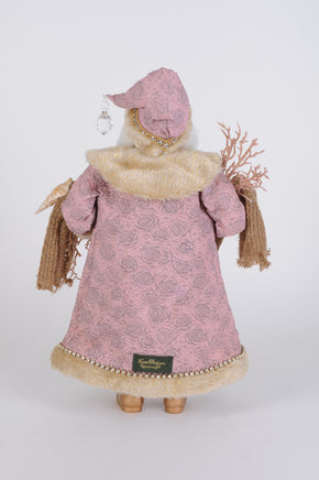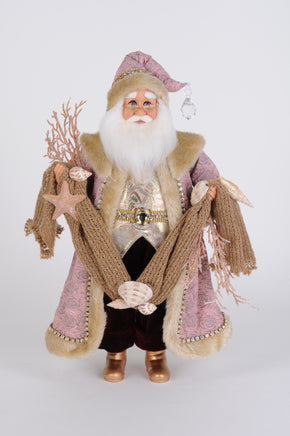 Bring the calming charm of the coast to your holiday decor with the Rose Gold Coastal Santa figurine, a unique blend of seaside serenity and festive splendor. Dressed in soft beach-inspired hues, this Santa radiates peaceful holiday cheer with a distinctly nautical flair. His luxurious rose-toned coat, adorned with gold faux fur trim and shimmering embellishments, is complemented by a shimmering brocade vest and rich velvet pants. In his hands, Santa holds a knitted driftwood-colored garland adorned with an assortment of realistic seashells, coral accents, and a starfish – perfect for celebrating Christmas by the sea. The Rose Gold Coastal Santa is a stunning addition to any holiday collection, ideal for those who dream of a sandy, seashell-strewn Christmas. Whether you're decorating a beach house or just want to infuse your home with coastal charm, this figurine makes a splash.
