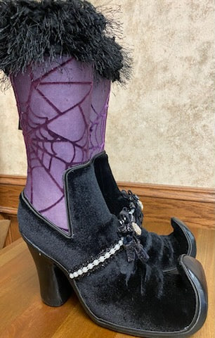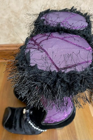 Add a touch of spooky glam to your Halloween decorations with this witch boot centerpiece! Designed with rich black velvet, curled toes, and a sparkling beaded strap, this boot features a tall faux stocking in purple with black spider web detailing. Finished with a fluffy black faux fur cuff and ornate flower embellishments, it's the perfect blend of eerie and elegant!