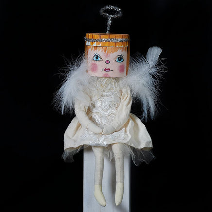 The Angelisa Box Head Doll is a celestial vision in white, poised to become a heavenly highlight of your Christmas decor. This 14-inch tall angelic doll marries the traditional with the unexpected, featuring a stuffed fabric body and a pressed paper box head that ingeniously opens to stow away holiday surprises.