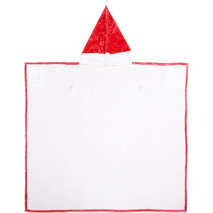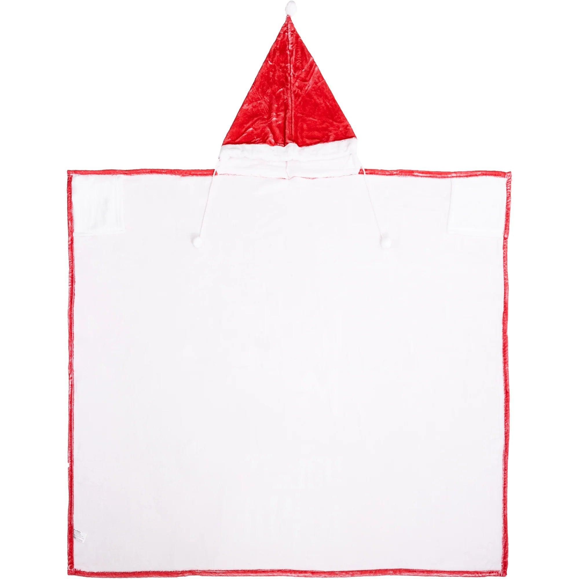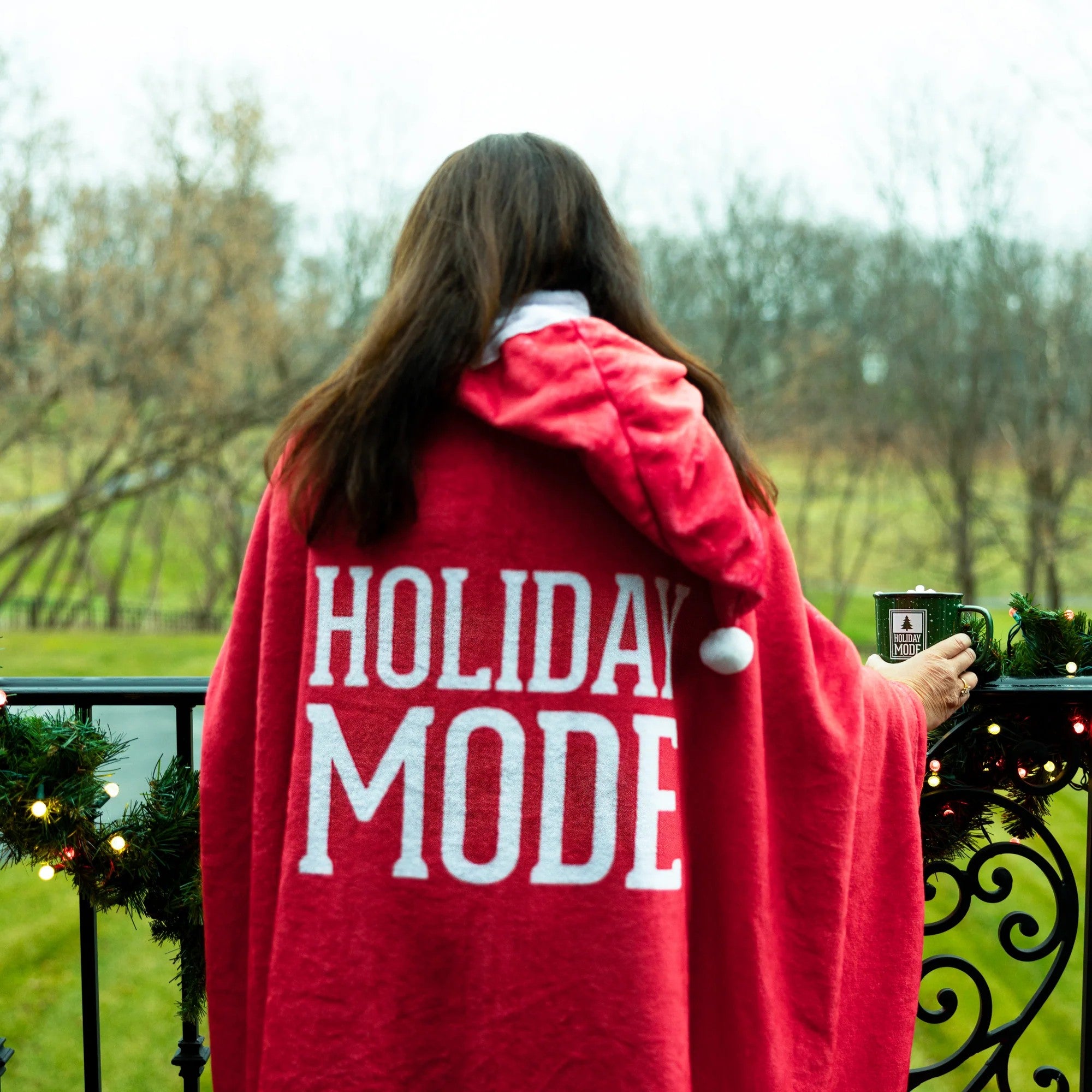 IN-HOUSE DESIGN: All white interior with a red exterior and large white "Holiday Mode" sentiment printed onto the center back of the cloak. The pockets are perfect for putting hands into to wrap up tight with warmth and maybe even hold some small snacks or a phone. Decorative puff balls attached to strings hang from the hood's front as well as the hood's tip.