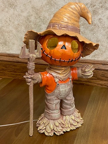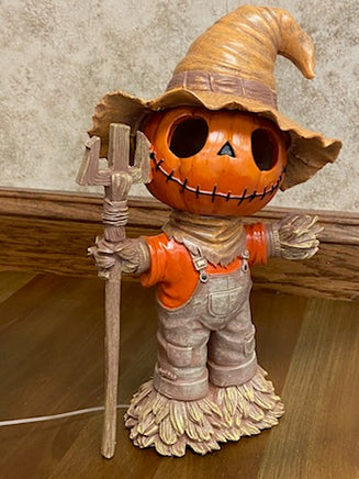 Add some festive charm to your fall and Halloween décor with this adorable Pumpkin Scarecrow Figurine! Featuring a smiling jack-o’-lantern face, rustic straw details, and a classic scarecrow outfit with overalls and a floppy hat, this piece is sure to brighten up any room. The scarecrow is holding a pitchfork and has a built-in light that glows warmly through the pumpkin face, creating the perfect seasonal accent.
